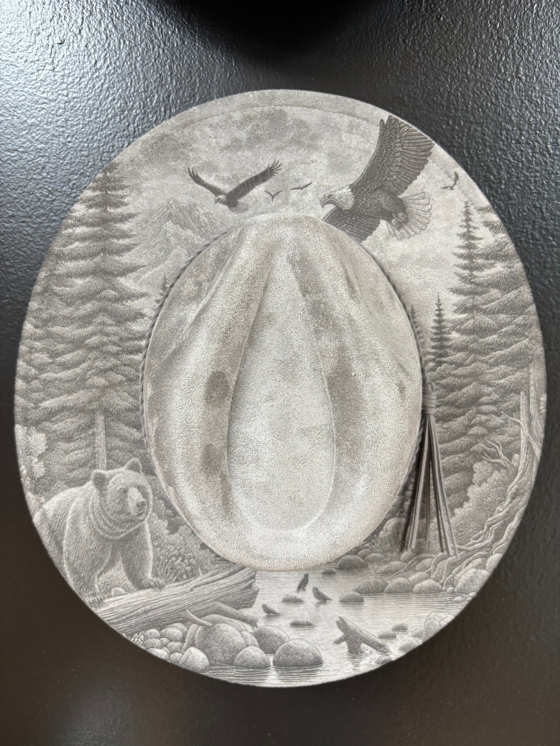 Our gray vegan suede wide brim hats are now available featuring a stunning bear and eagle laser engraved design.