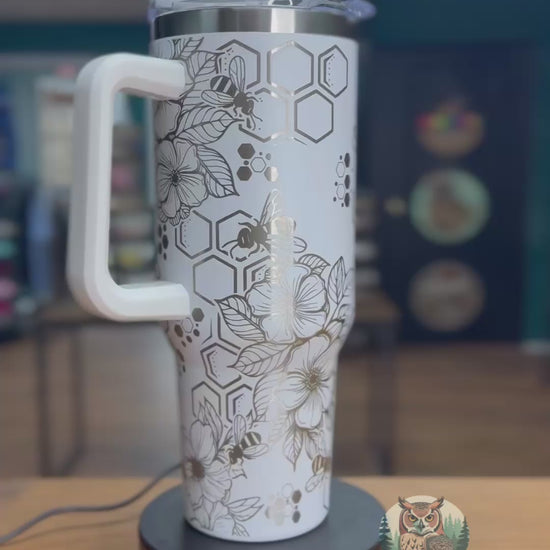 "Keep your drink at the perfect temperature with our Bee Floral 40oz Tumbler! Made with stainless steel and featuring a full wrap design, this tumbler is both functional and stylish. Plus, the laser engraving adds a unique touch. Don't bee caught without it!"