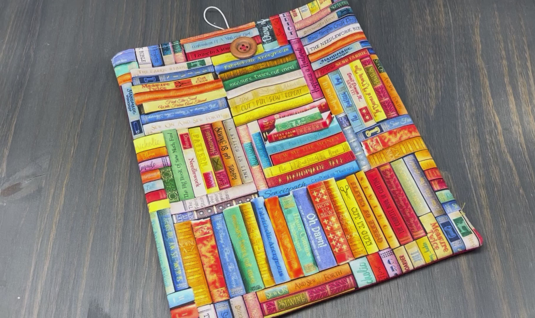 The Bookshelf Book Sleeve is a must-have for book lovers. Made from 100% cotton fabric and featuring a button and loop closure, it protects large hardcover books and larger paperback books from damage. The outer pocket, equipped with a snap closure, is perfect for storing pens and bookmarks while on the go. The sturdy polyester interfacing provides added durability. Each button may vary, making each sleeve unique.