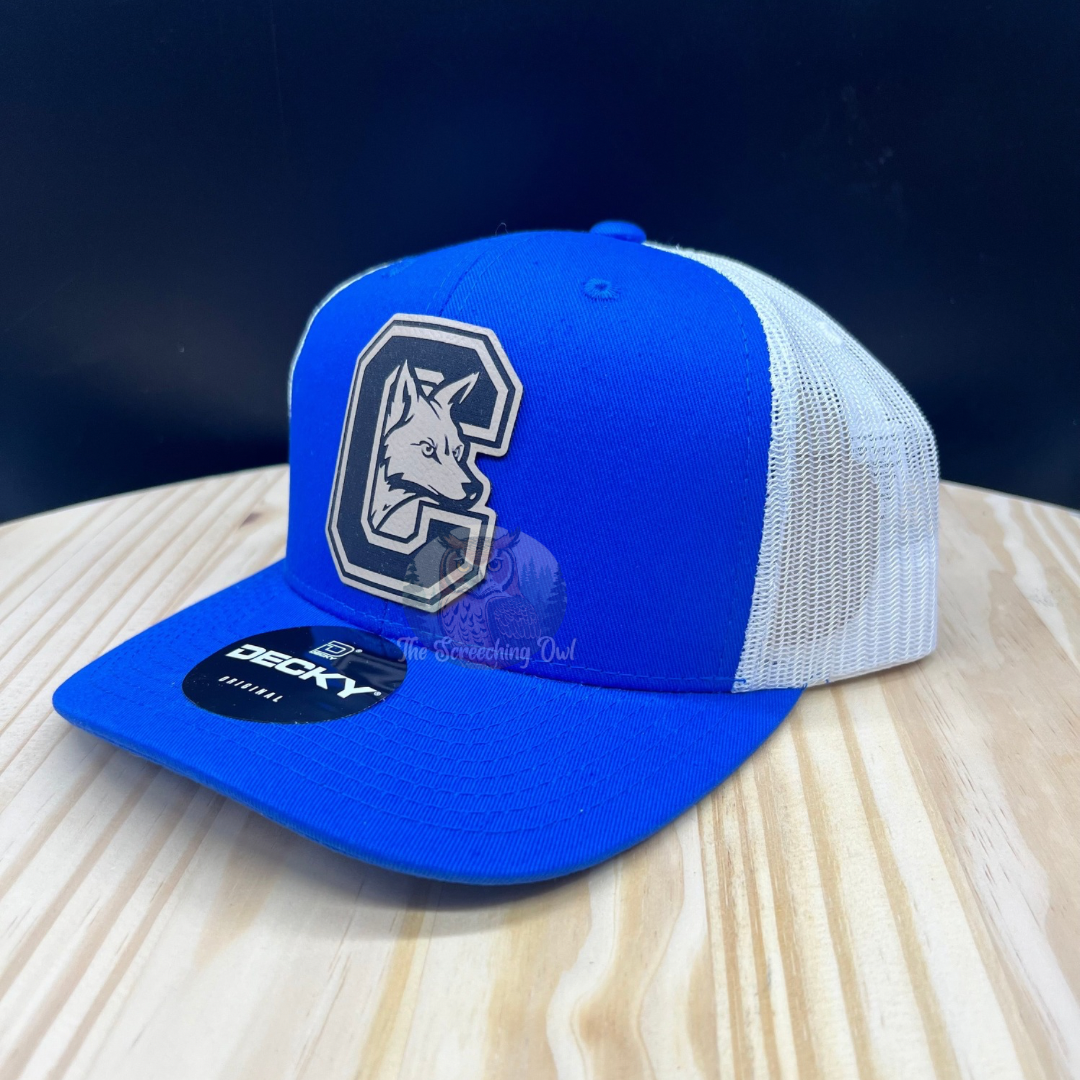 Royal Blue/White Hat Featuring: A beige leatherette Candor Coyotes patch.