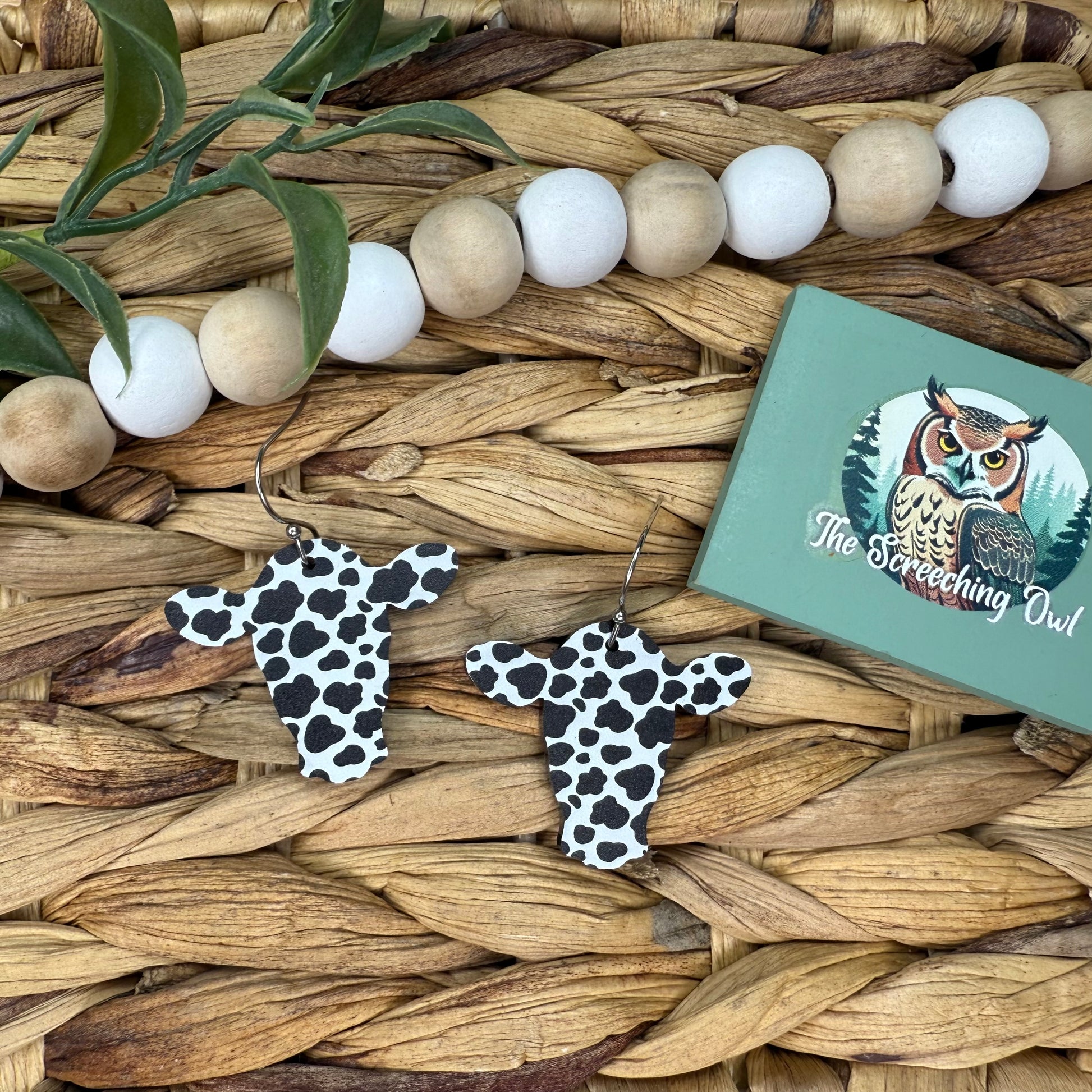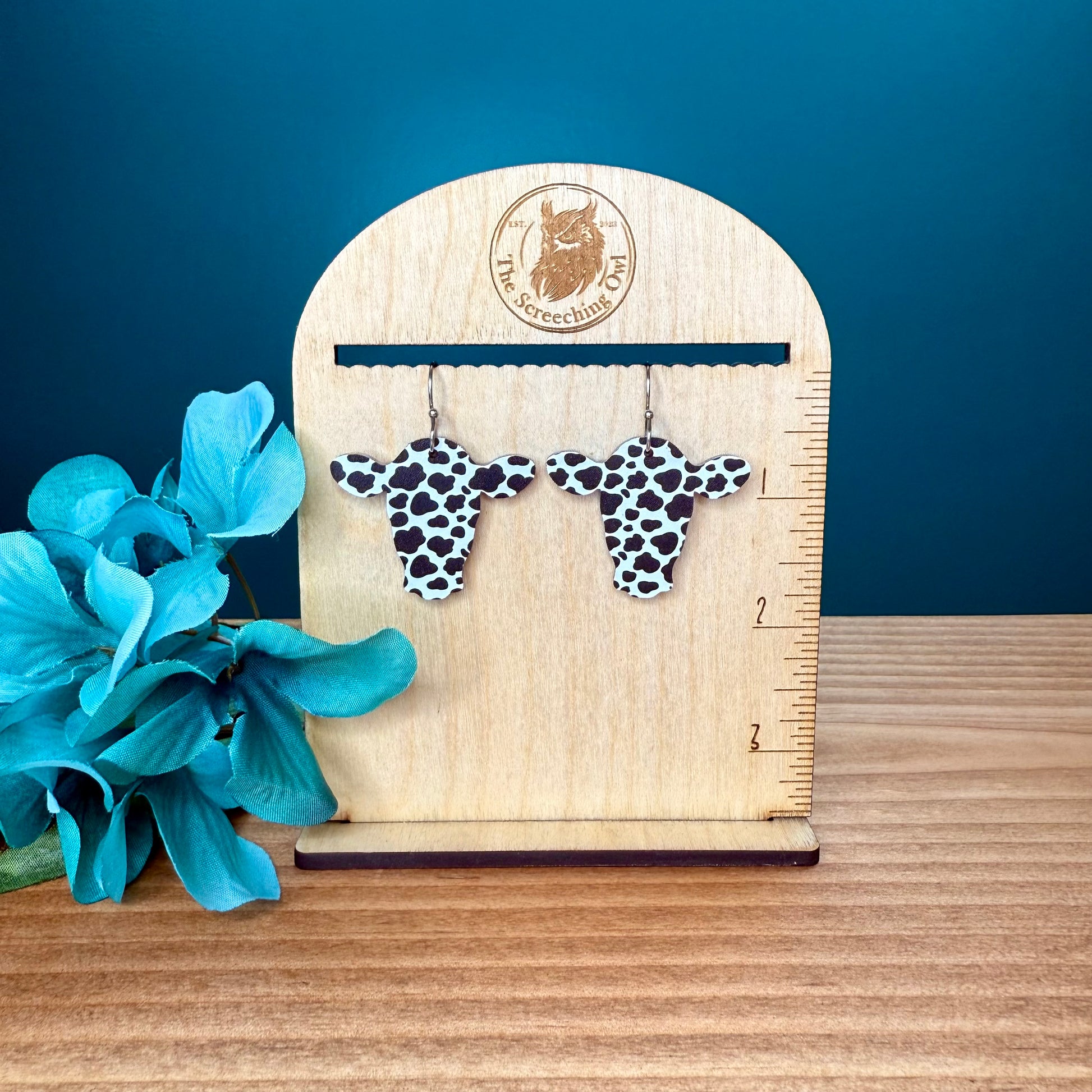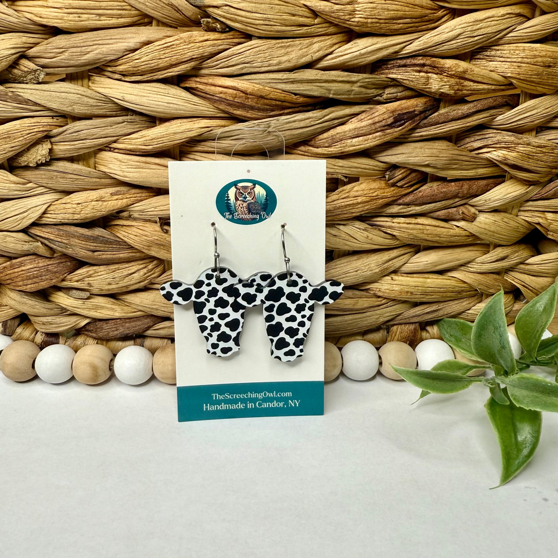 "Moo-ve over boring earrings, the Cow Head Earrings are here to add some quirky charm to your look! With lightweight acrylic and stainless steel wires for sensitive ears, you can moo-ve comfortably and confidently all day long. Perfect for any bovine-lover or anyone looking to add a playful touch to their style. (No cows were harmed in the making of these earrings.)"
