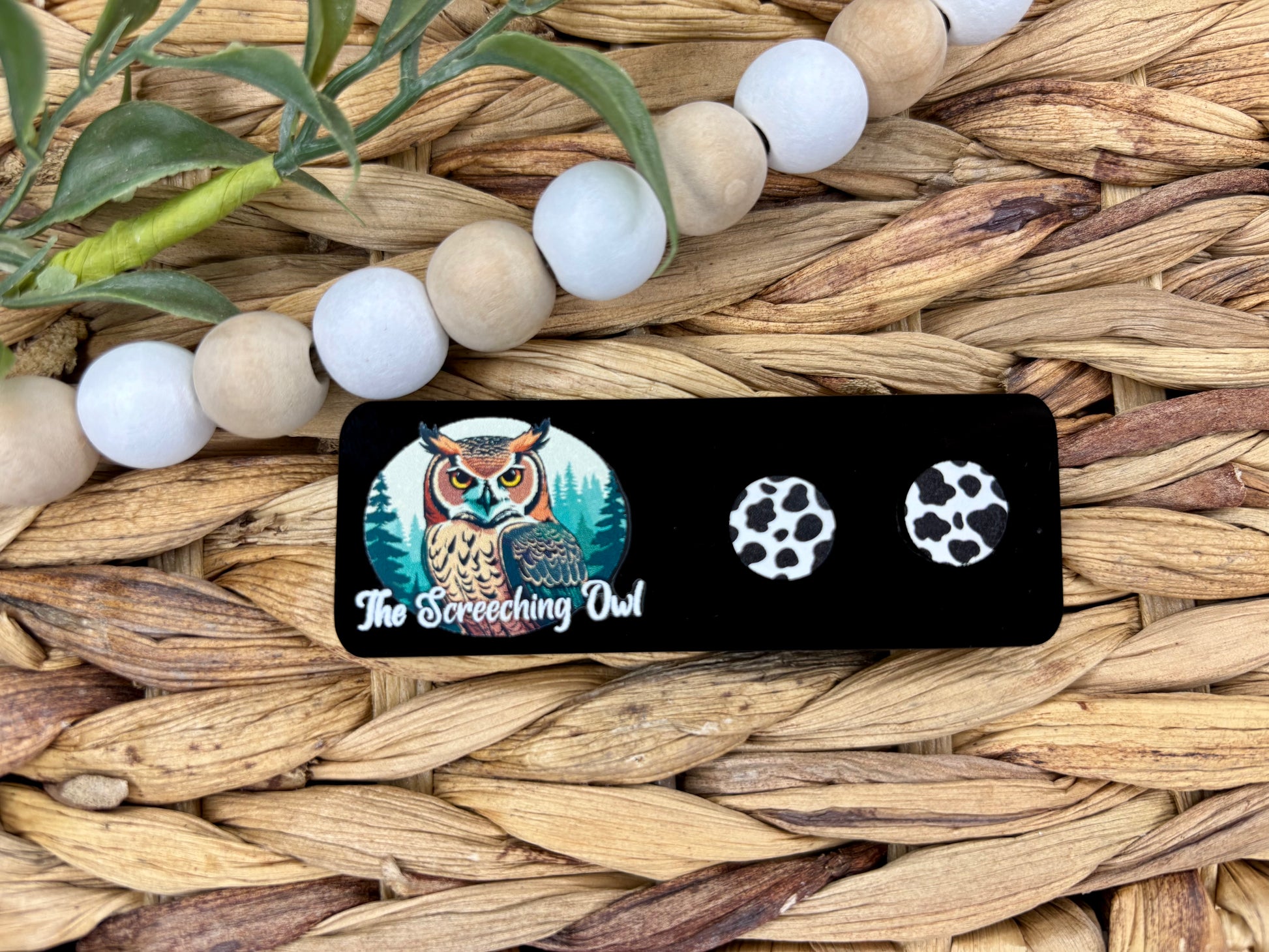 These cow print stud earrings are perfect for showcasing your love for animals. Made with stainless steel posts, they are also suitable for those with sensitive ears. Add a touch of fun and personality to any outfit with these earrings.