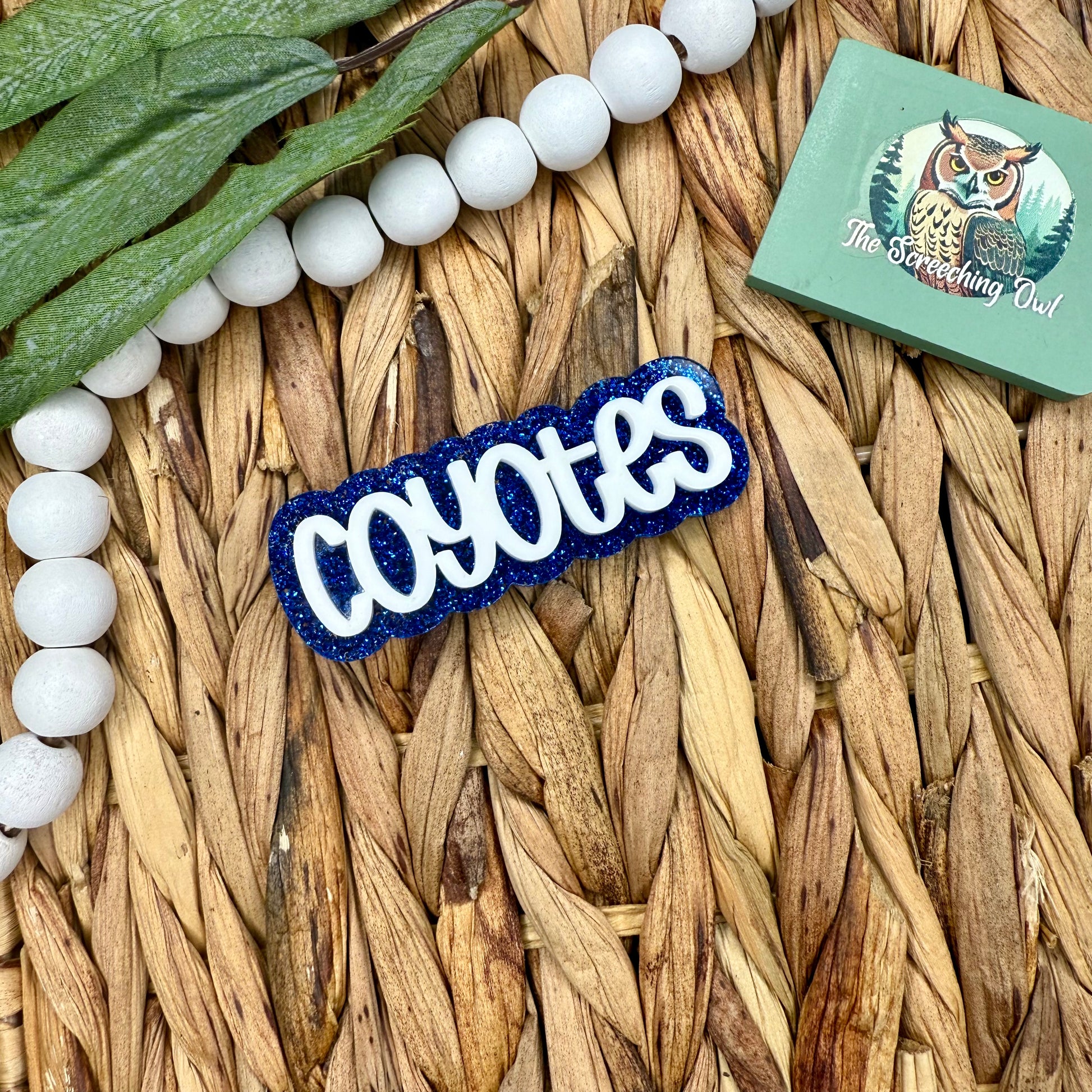 Get extra spirited with our Coyotes Hair Clip! Featuring a Blue glitter acrylic backing and white writing, this hair clip is perfect for cheering on your coyotes team. The alligator clip ensures that it stays securely in your hair while showing off your team spirit. Go coyotes!