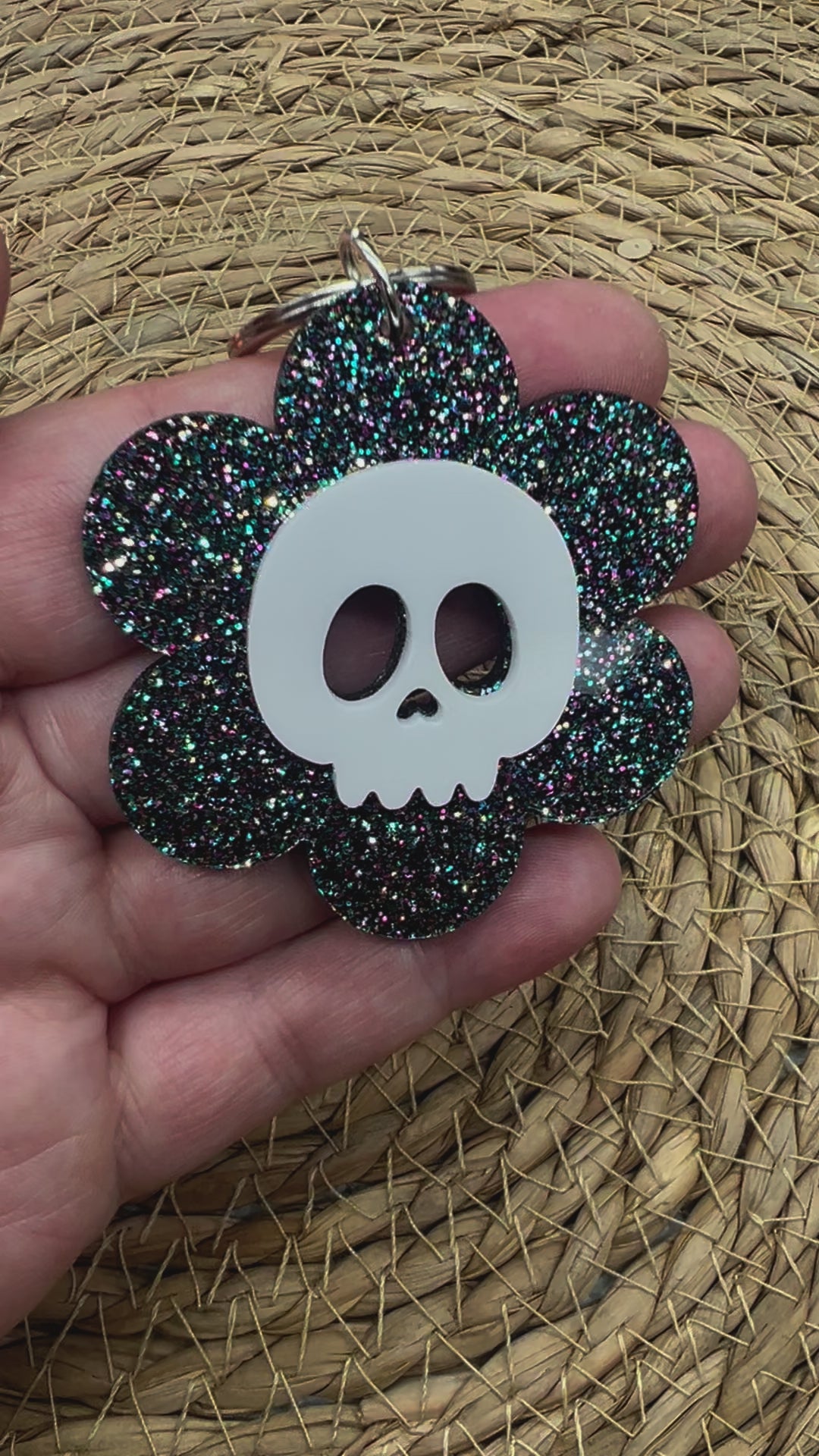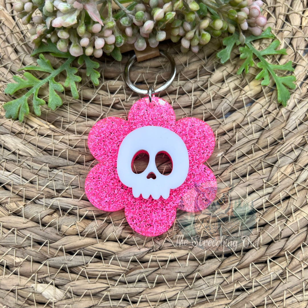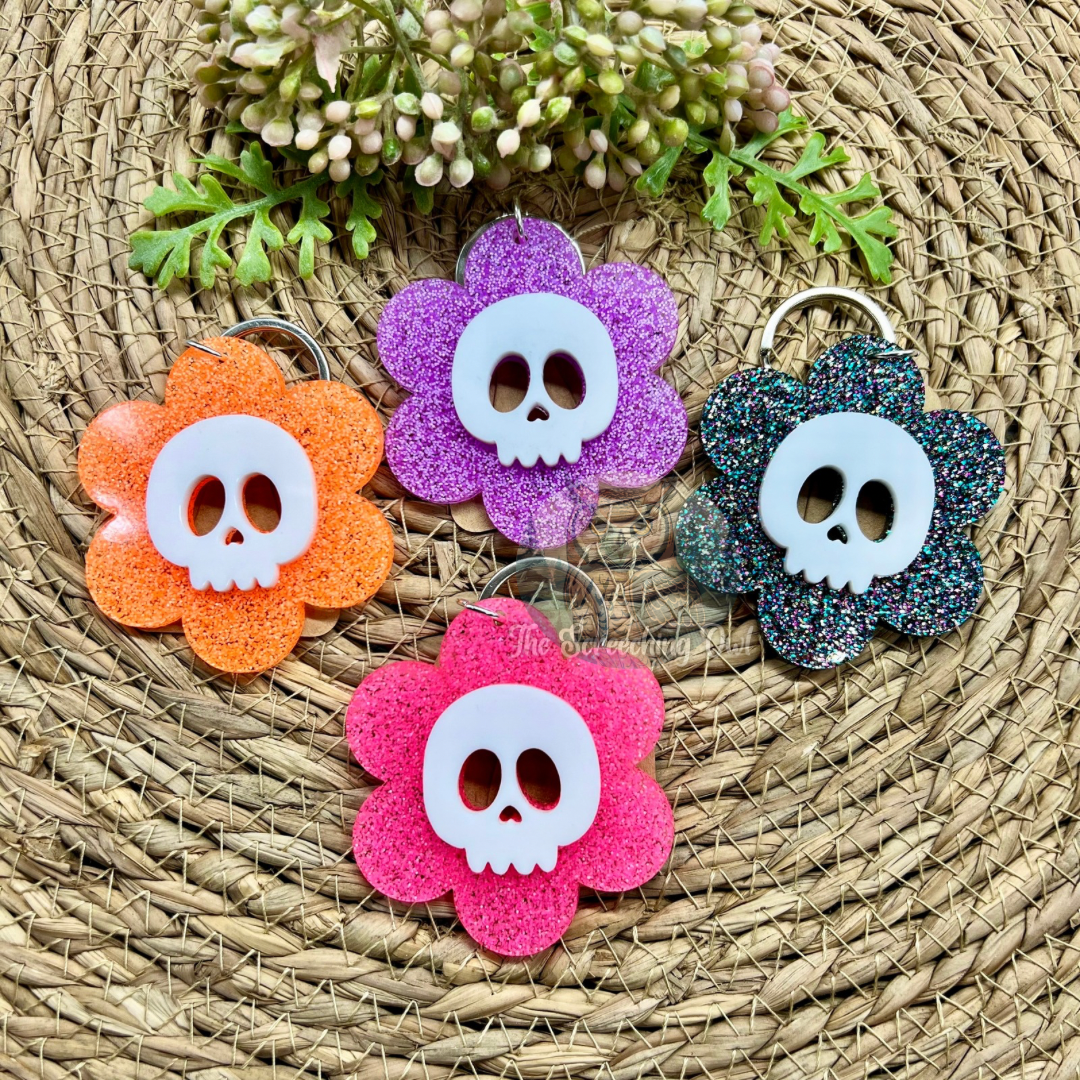 "Enhance your daily style with our Skull Floral Acrylic Keychain. Made from neon glitter acrylic, this keychain adds a pop of color to your keys or bag. With its durable quality, it's a trendy yet functional accessory for any fashion-forward individual. Get yours today!”
