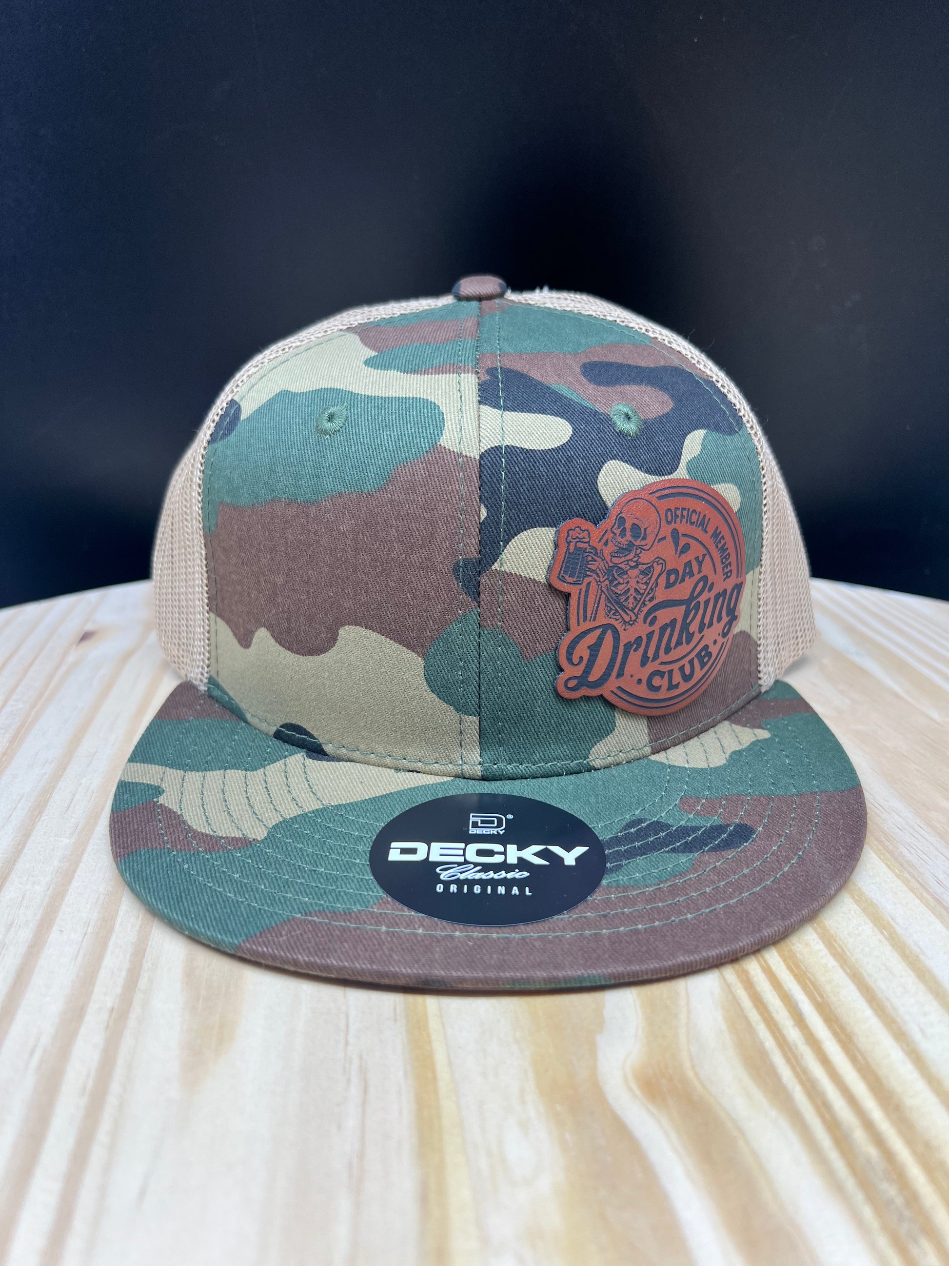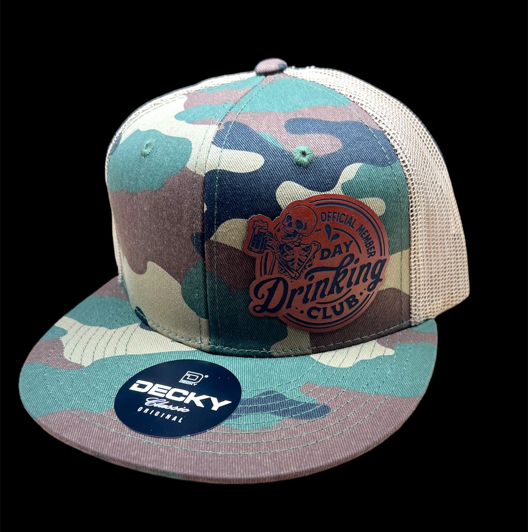 Camo/Khaki Hat Featuring: A Saddle Brown leatherette patch saying, “Official Member, Day Drinking Club.”