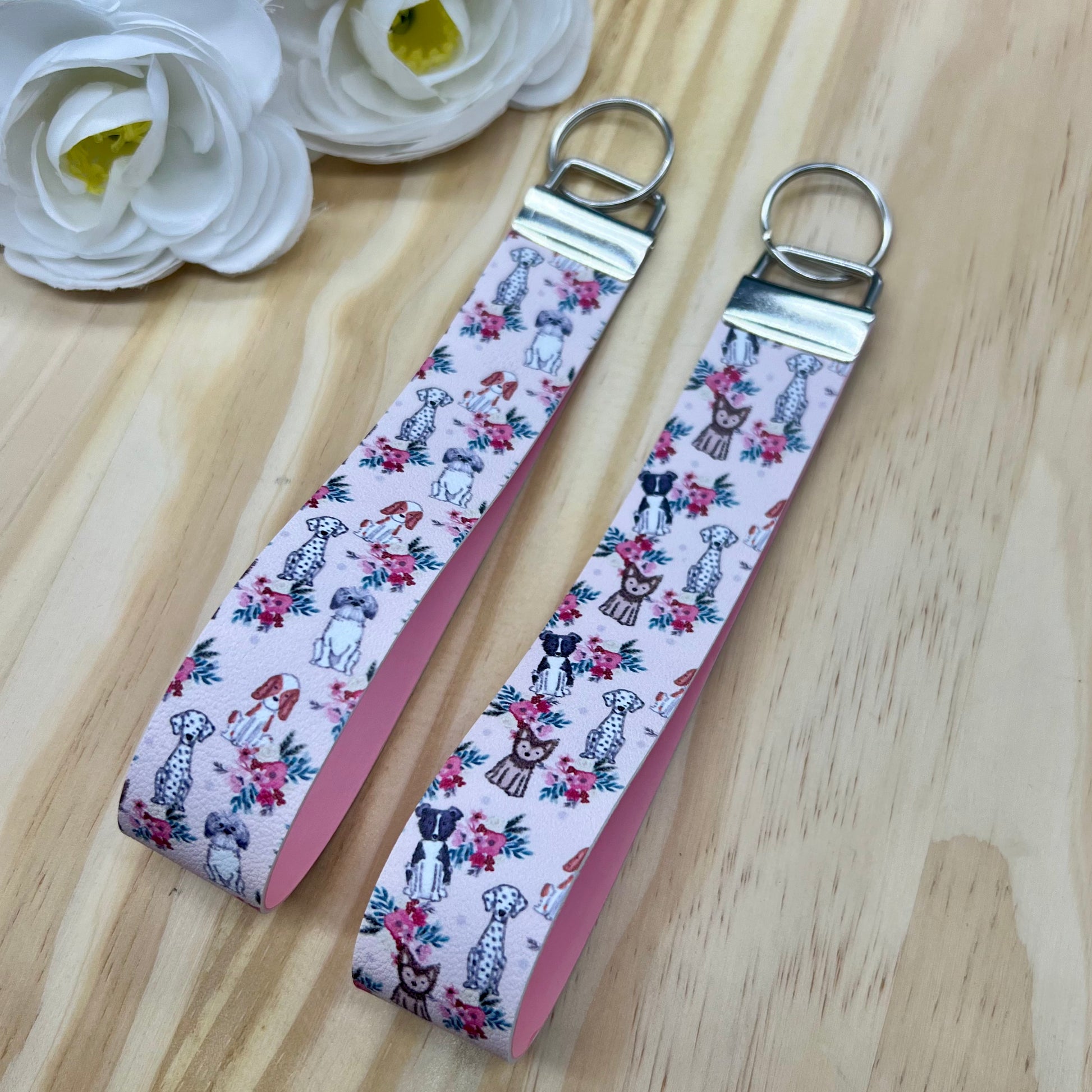 Floral Dog key fob/keychain. Made of faux leather with pink HTV backing.