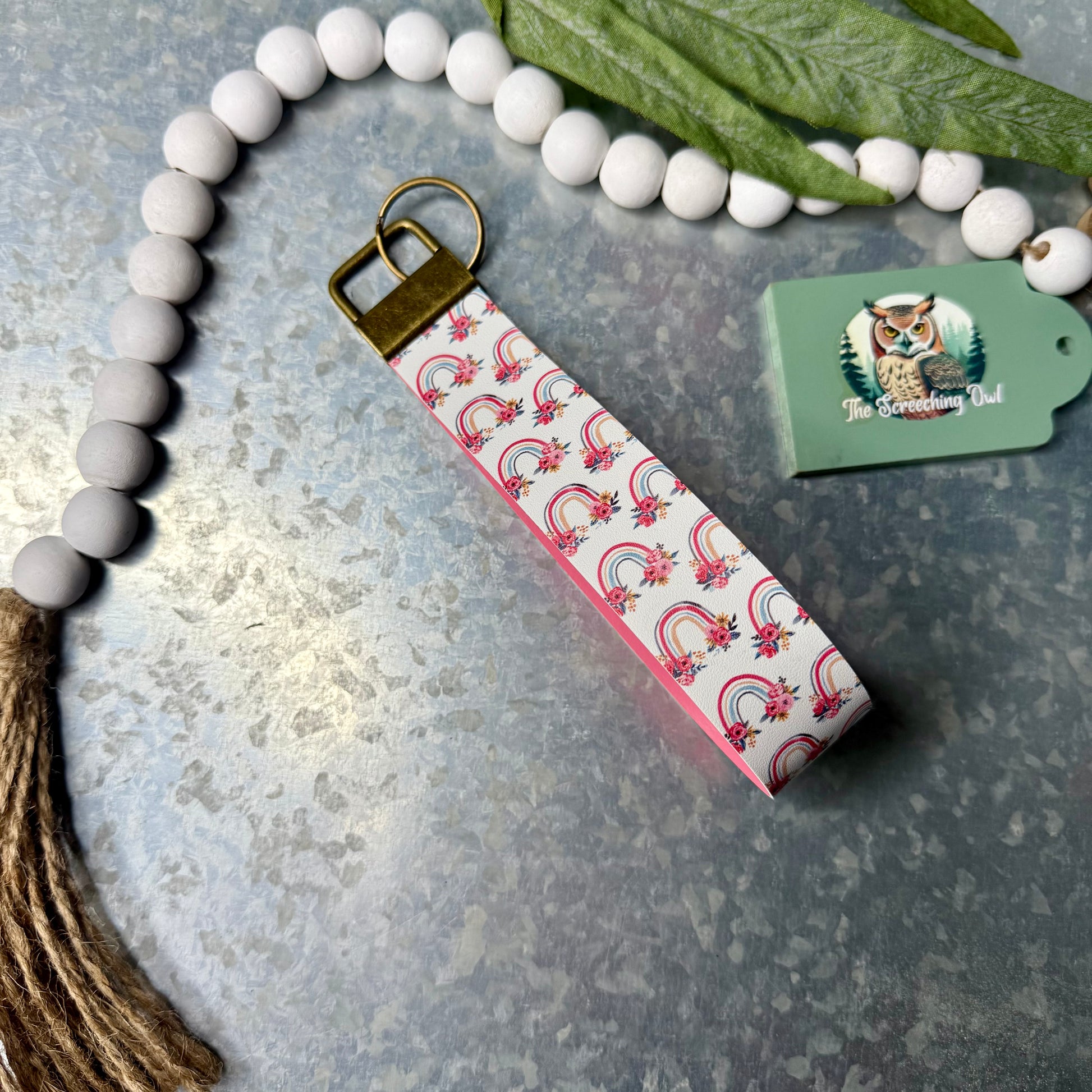 Floral Rainbows key fob/keychain. Made of faux leather with pink HTV backing.