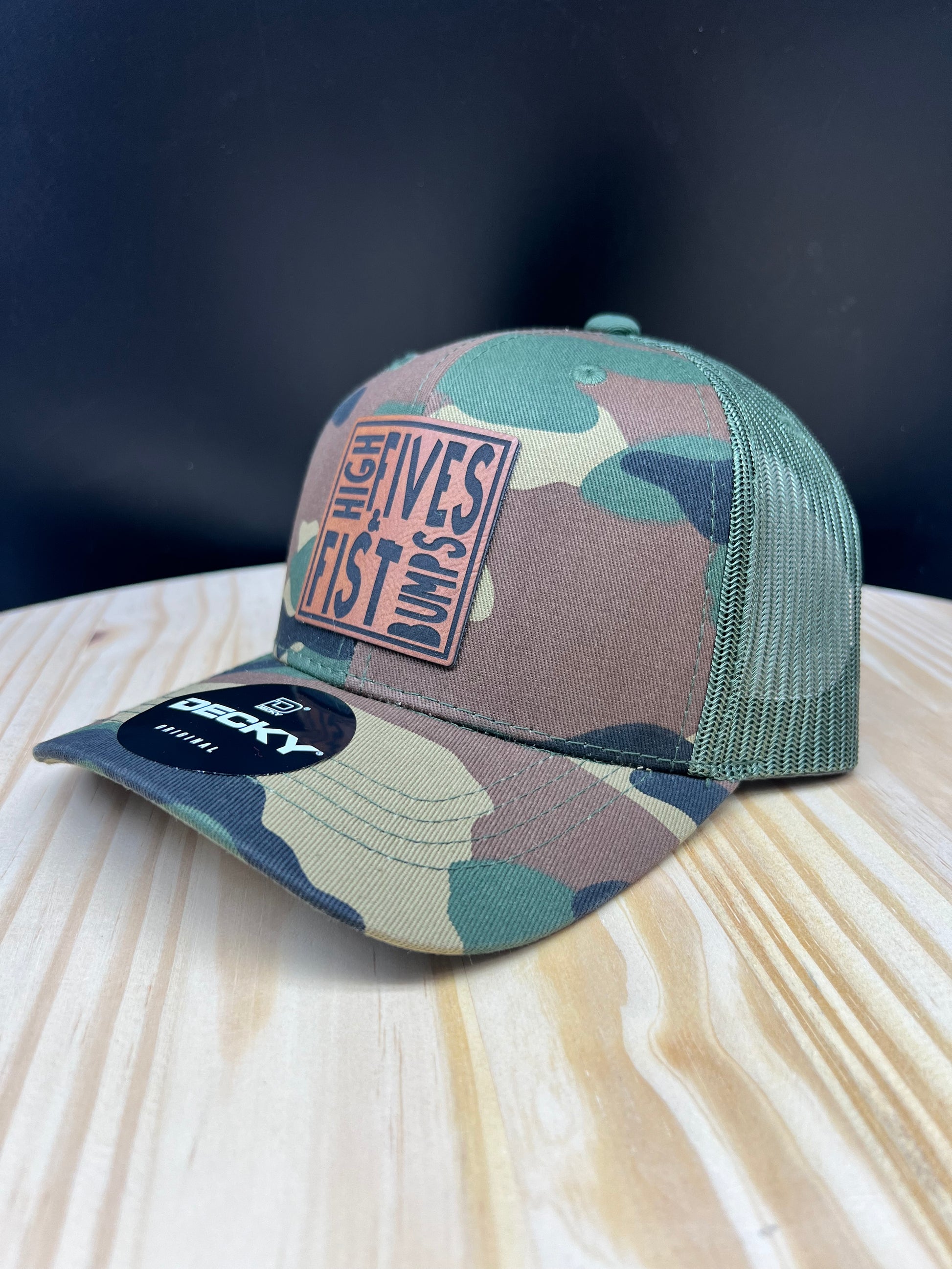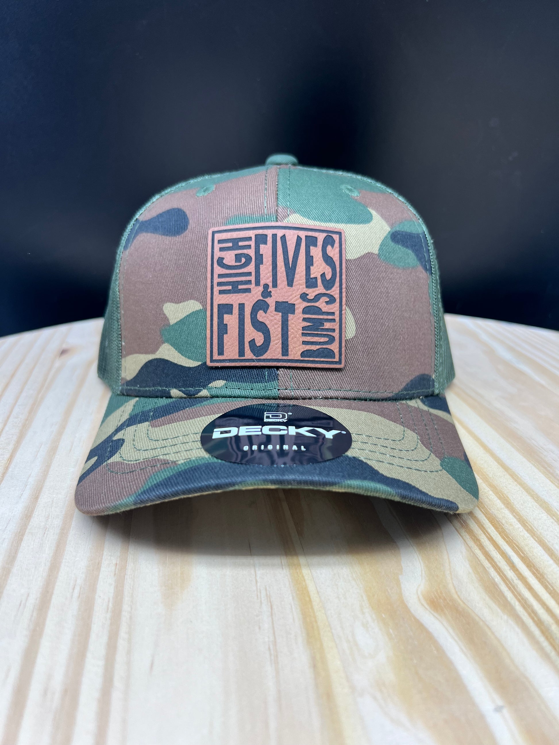 Camo/Olive Green Hat Featuring: A Rawhide brown leatherette patch saying, “High Fives & Fist Bumps.”