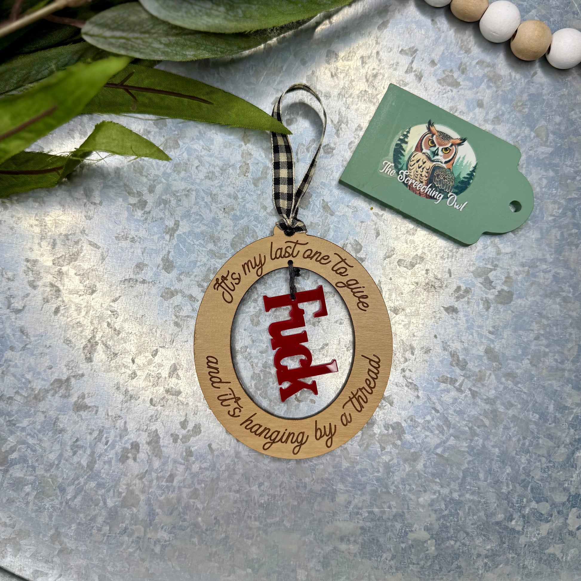Expertly crafted with wood and acrylic, this funny ornament is the perfect gift for those who have reached 'no more fucks to give' status. With its humorous message, "It's my last fuck to give and it's hanging by a thread", this ornament serves as a reminder to let go and embrace a carefree attitude.