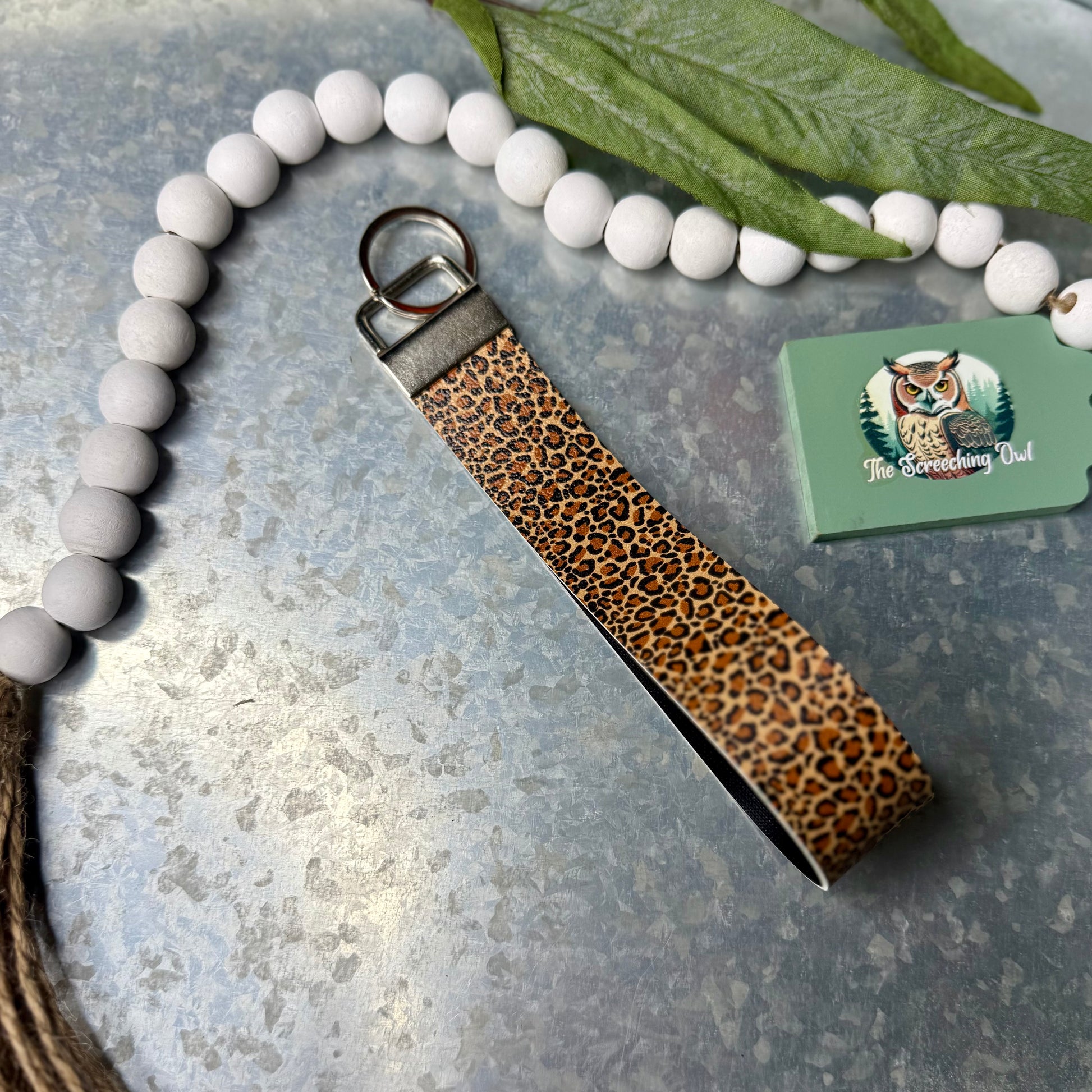 Leopard key fob/keychain. Made of faux leather with black HTV backing.