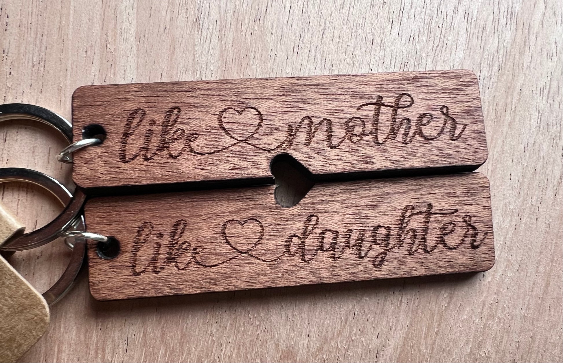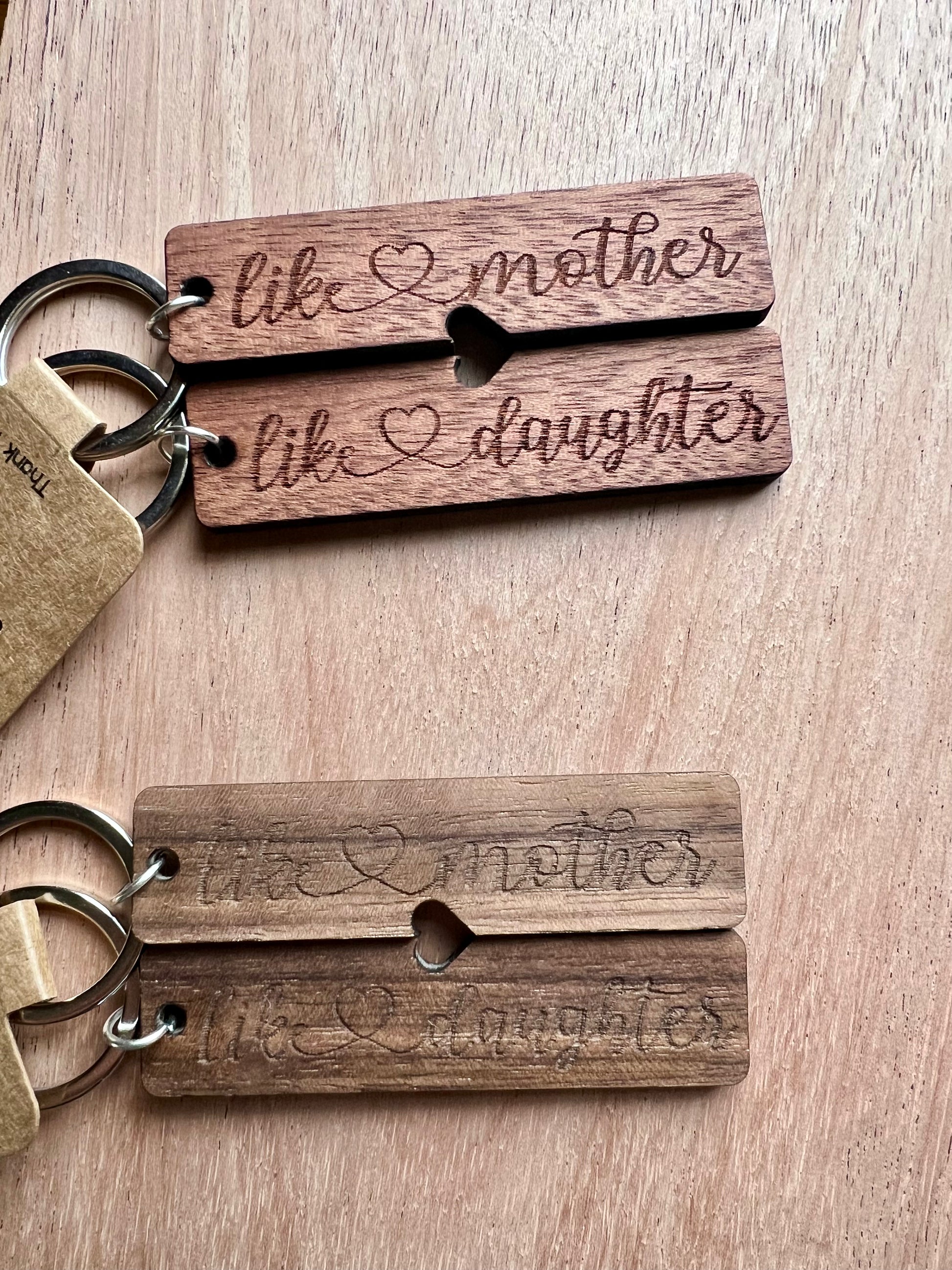 Celebrate the bond between a mother and daughter with this keychain set. A playful reminder that they share more than just looks, this set features two keychains with the phrase "like mother, like daughter." It's the perfect gift for Mother's Day, birthdays, or just because.