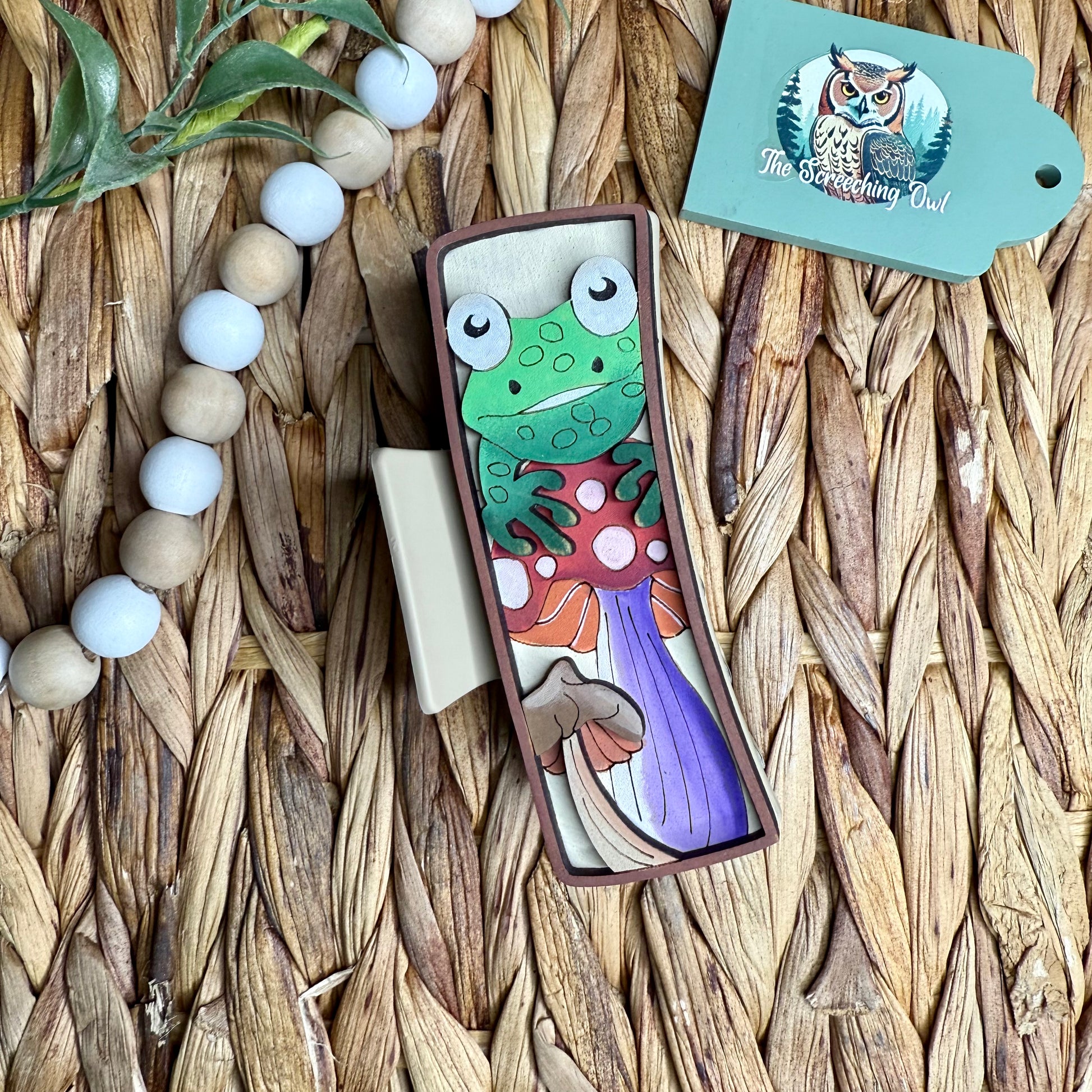 Elevate your hair game with our adorable Mushroom and Frog Claw Clip! This charming 4-inch accessory features whimsical hand-painted designs on quality wood. Perfect for securing your locks while adding a touch of enchanted forest fun to any hairstyle. Each clip brings a playful pop of personality to your look!