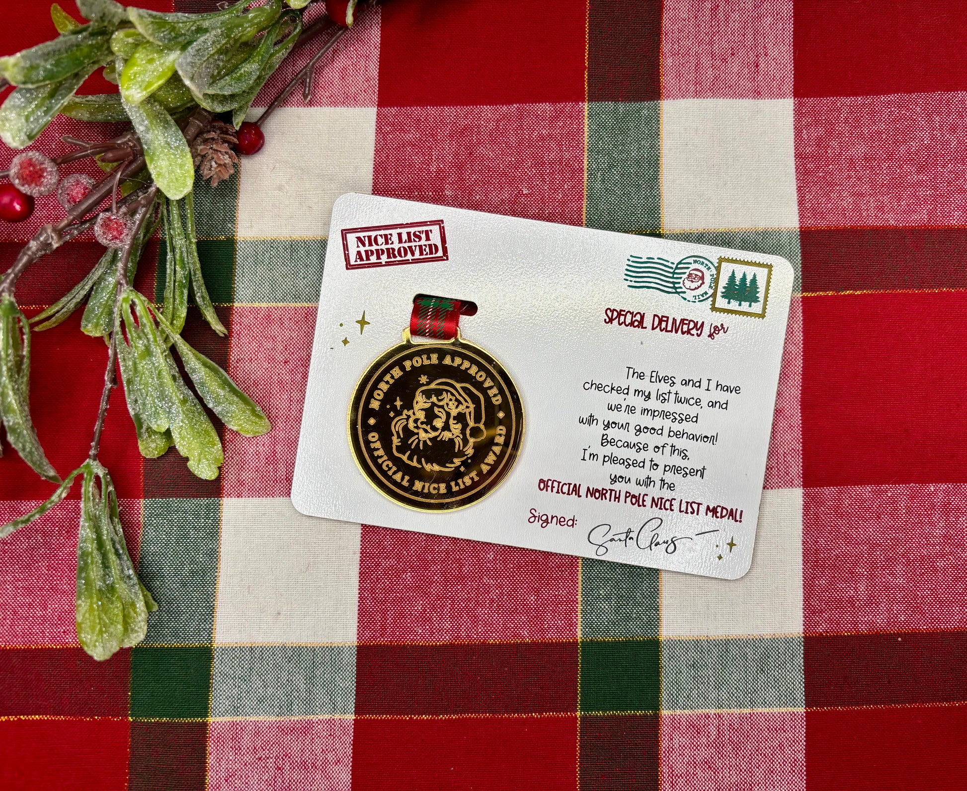 The Nice List Award is the ultimate recognition for children who have been exceptionally well-behaved. Not only is it a wearable medal, but it also includes a personalizable postcard to put your child's name. Make them feel special and proud with Santa's Official Nice List Award.