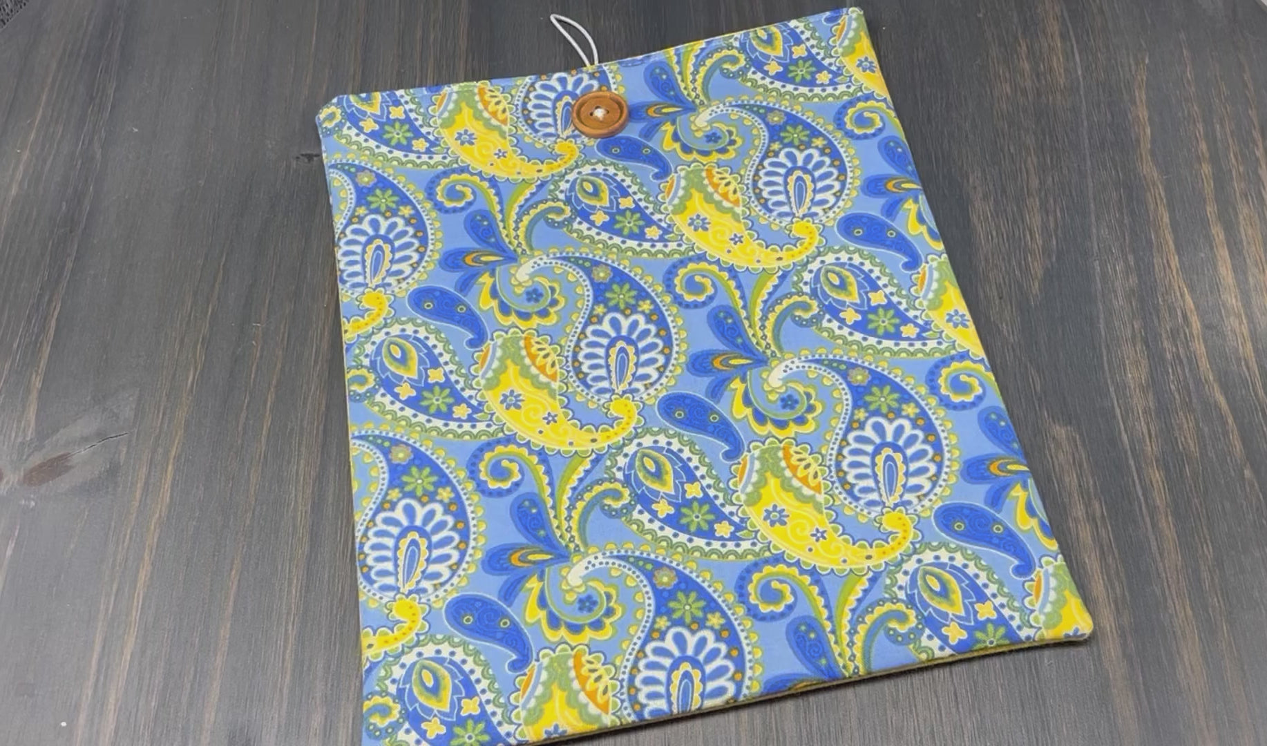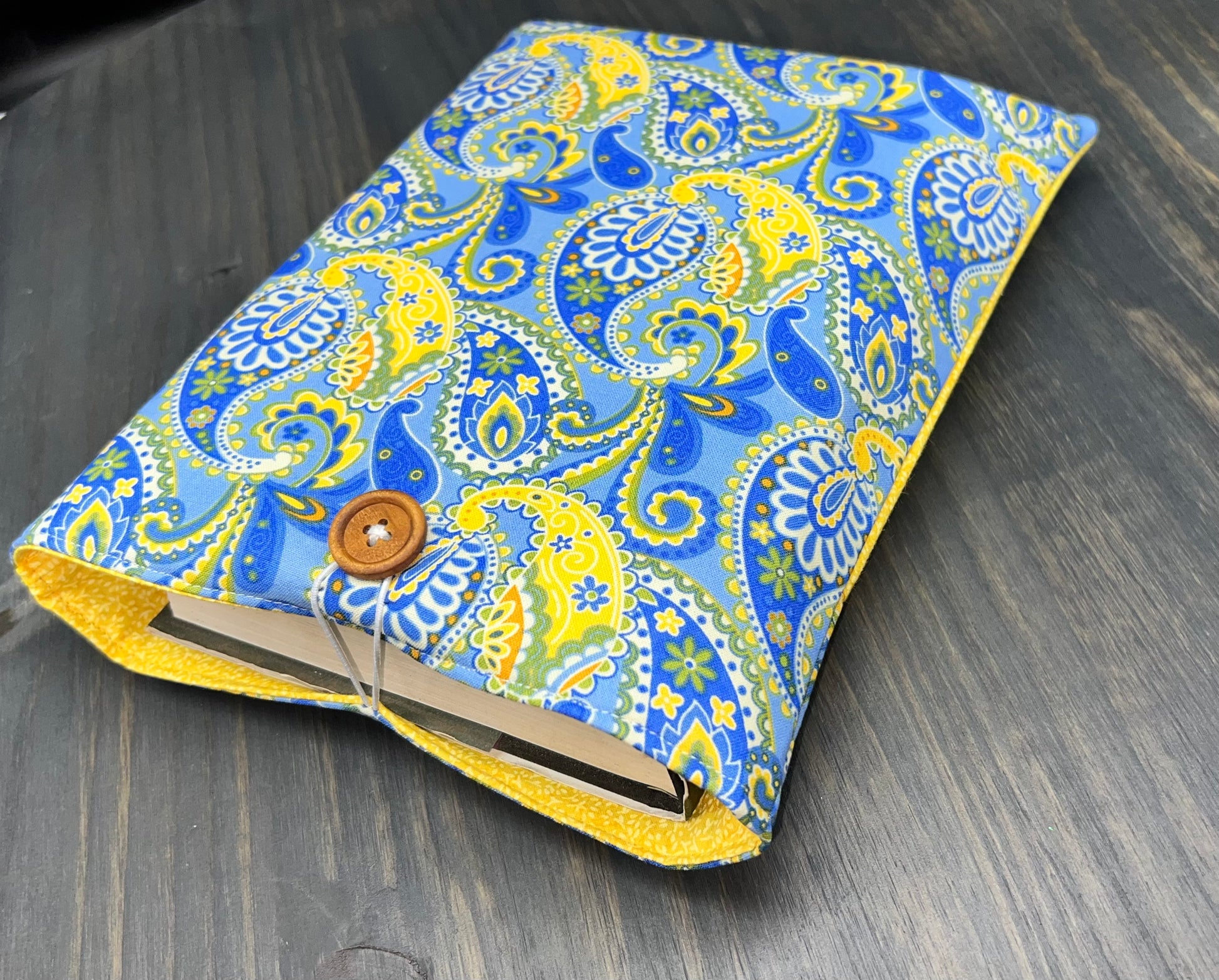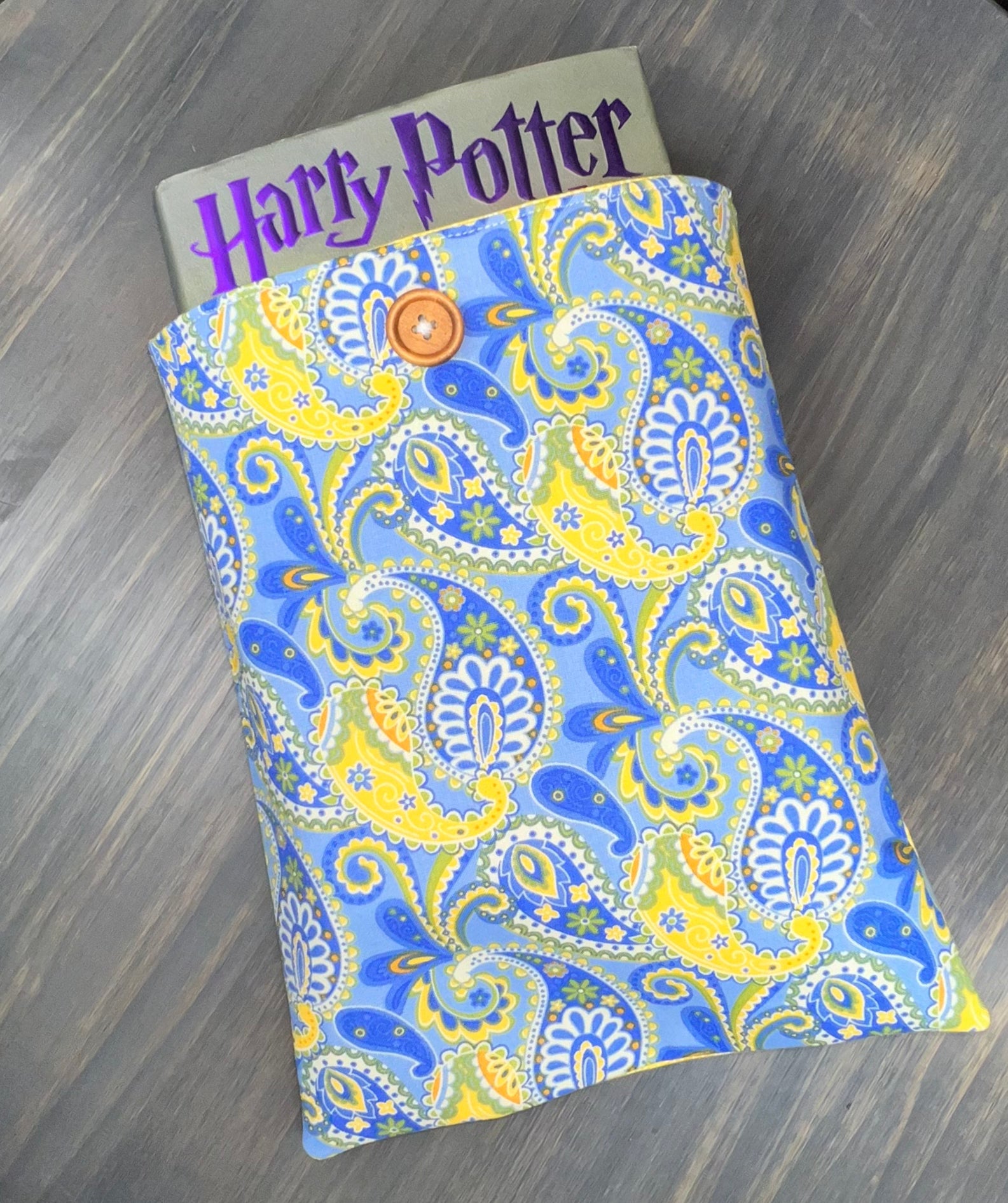 The Paisley Book/Tablet Sleeve is a must-have for book lovers. Made from 100% cotton fabric with fleece interfacing and featuring a button and loop closure, it protects large hardcover books and larger paperback books from damage. The outer pocket, equipped with a snap closure, is perfect for storing pens and bookmarks while on the go. The sturdy polyester interfacing provides added durability to the pocket. Each button may vary, making each sleeve unique.