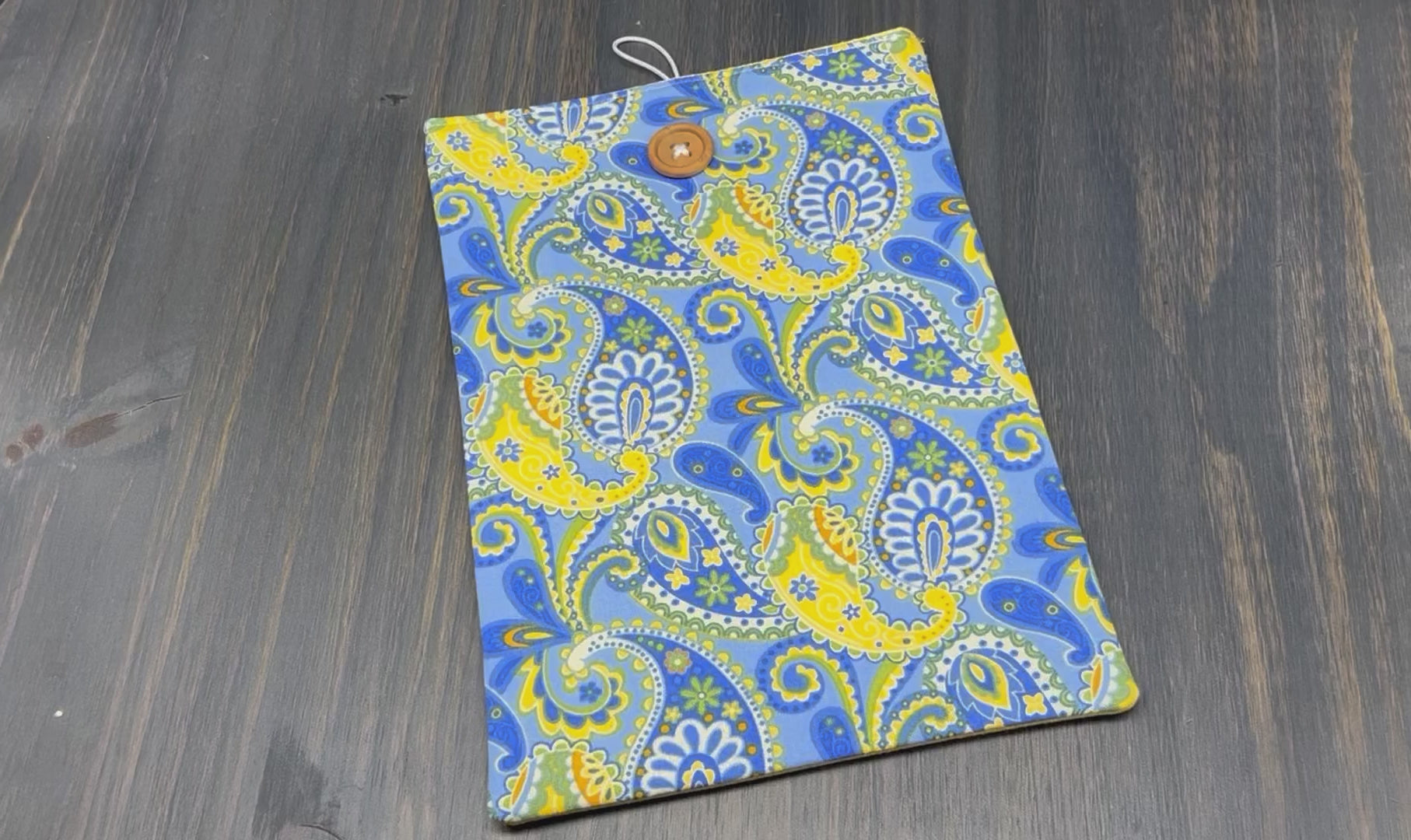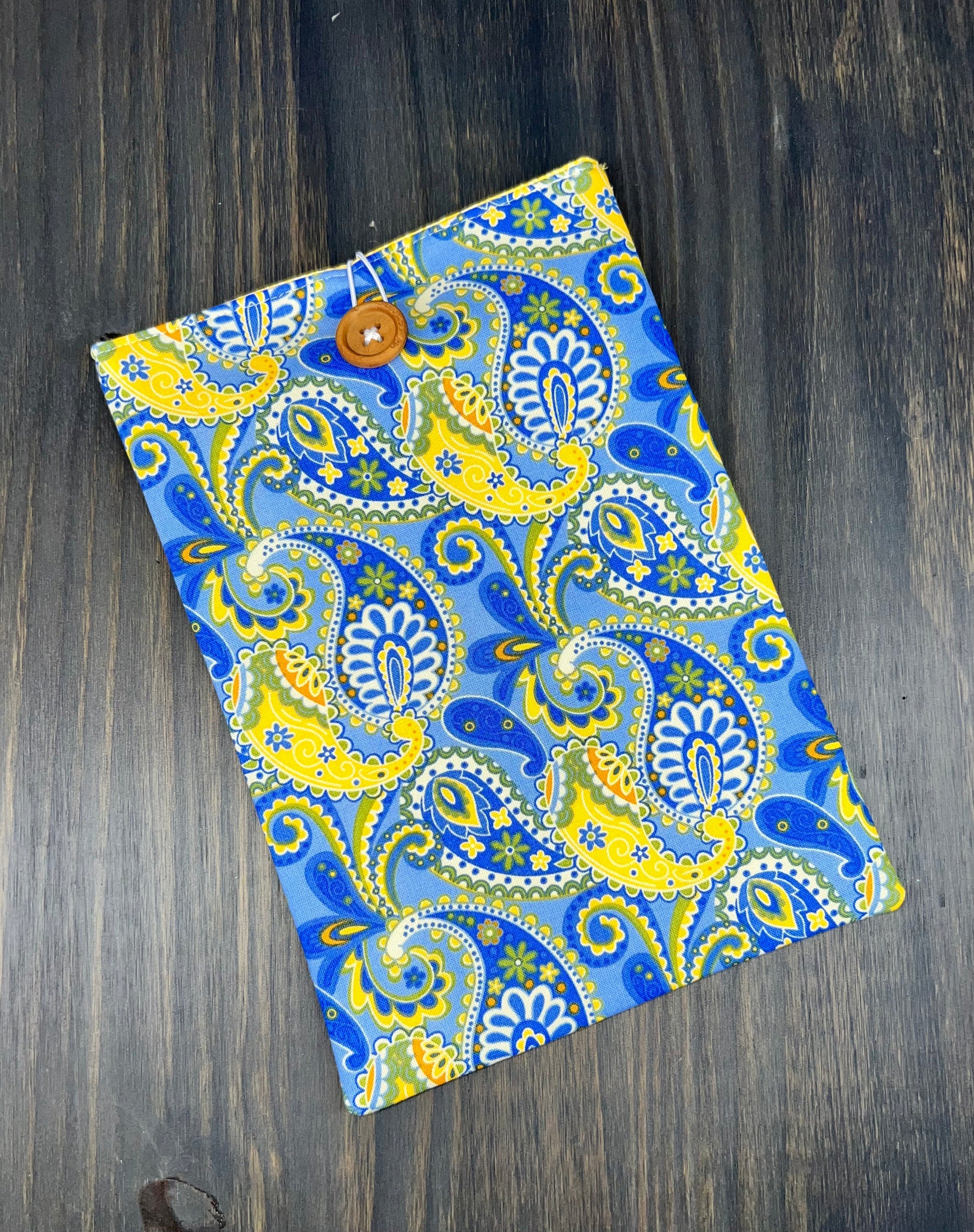 The Paisley Book/Kindle Sleeve is a must-have for book lovers. Made from 100% cotton fabric with fleece interfacing and featuring a button and loop closure. It protects small paperback books from damage. The outer pocket, equipped with a snap closure, is perfect for storing pens and bookmarks while on the go. The sturdy polyester interfacing provides added durability to the pocket. Each button may vary, making each sleeve unique.