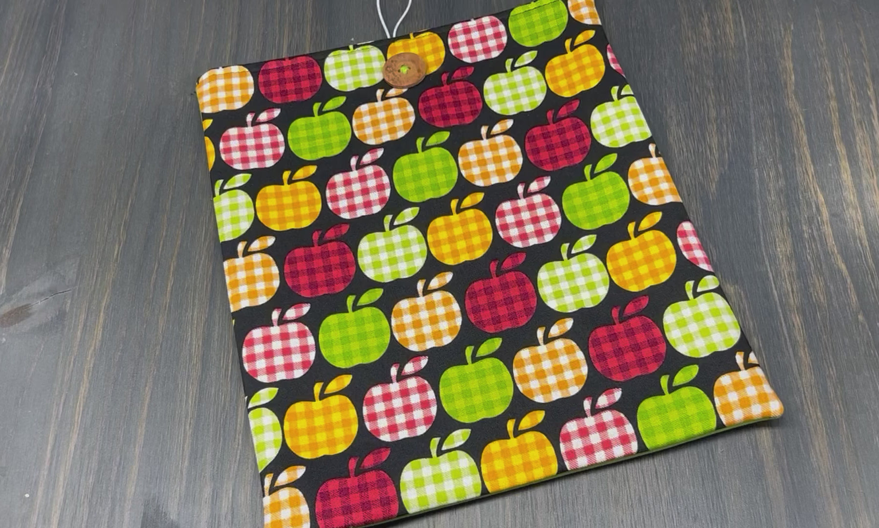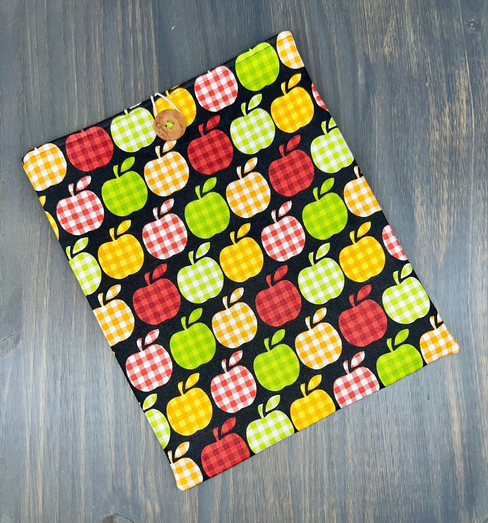 The Plaid Apples Book/Tablet Sleeve is a must-have for book lovers. Made from 100% cotton fabric with fleece interfacing and featuring a button and loop closure, it protects large hardcover books and larger paperback books from damage. The outer pocket, equipped with a snap closure, is perfect for storing pens and bookmarks while on the go. The sturdy polyester interfacing provides added durability to the pocket. Each button may vary, making each sleeve unique.