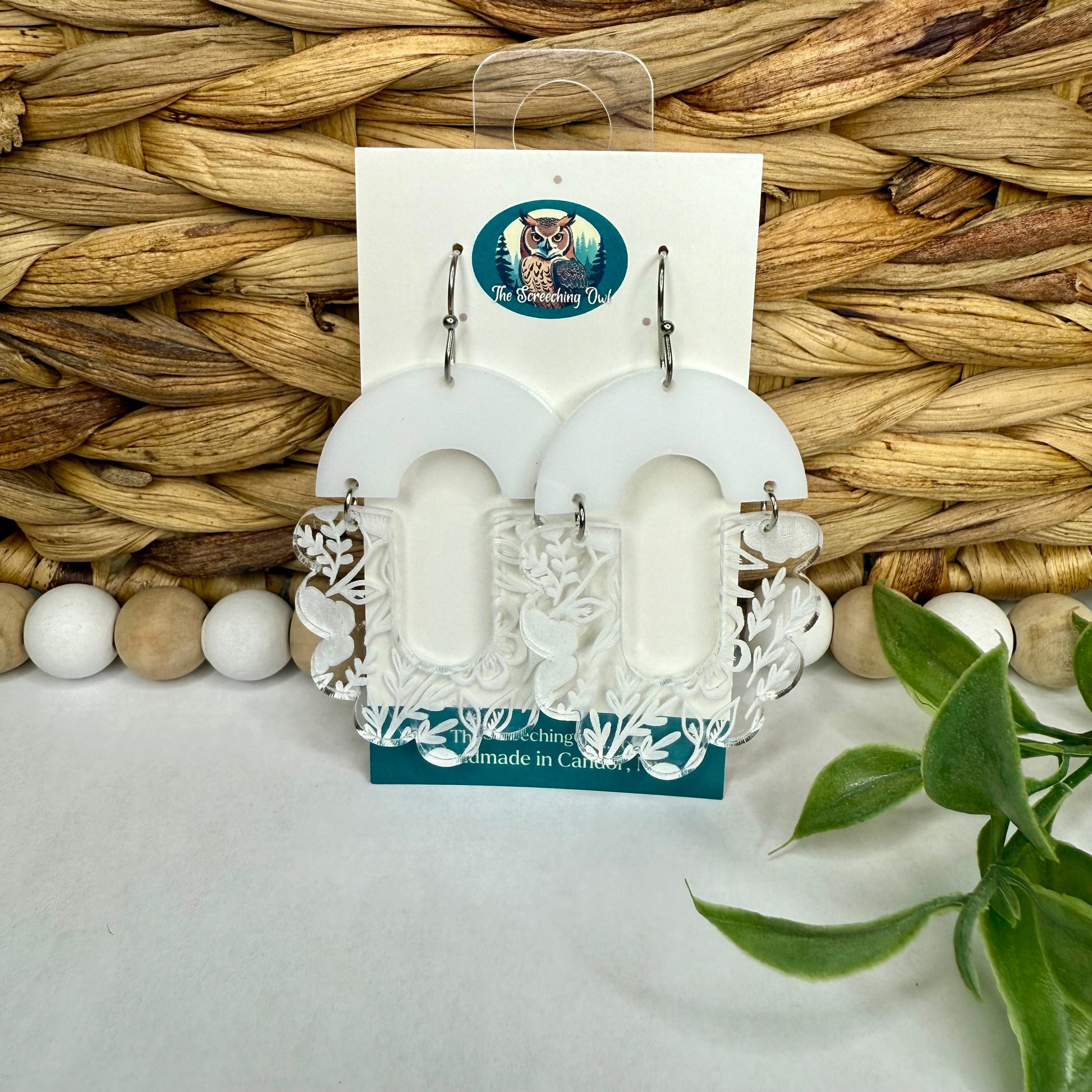 Scalloped Floral White Acrylic Earrings are made with white and clear acrylic. They have silver colored stainless steel wires.