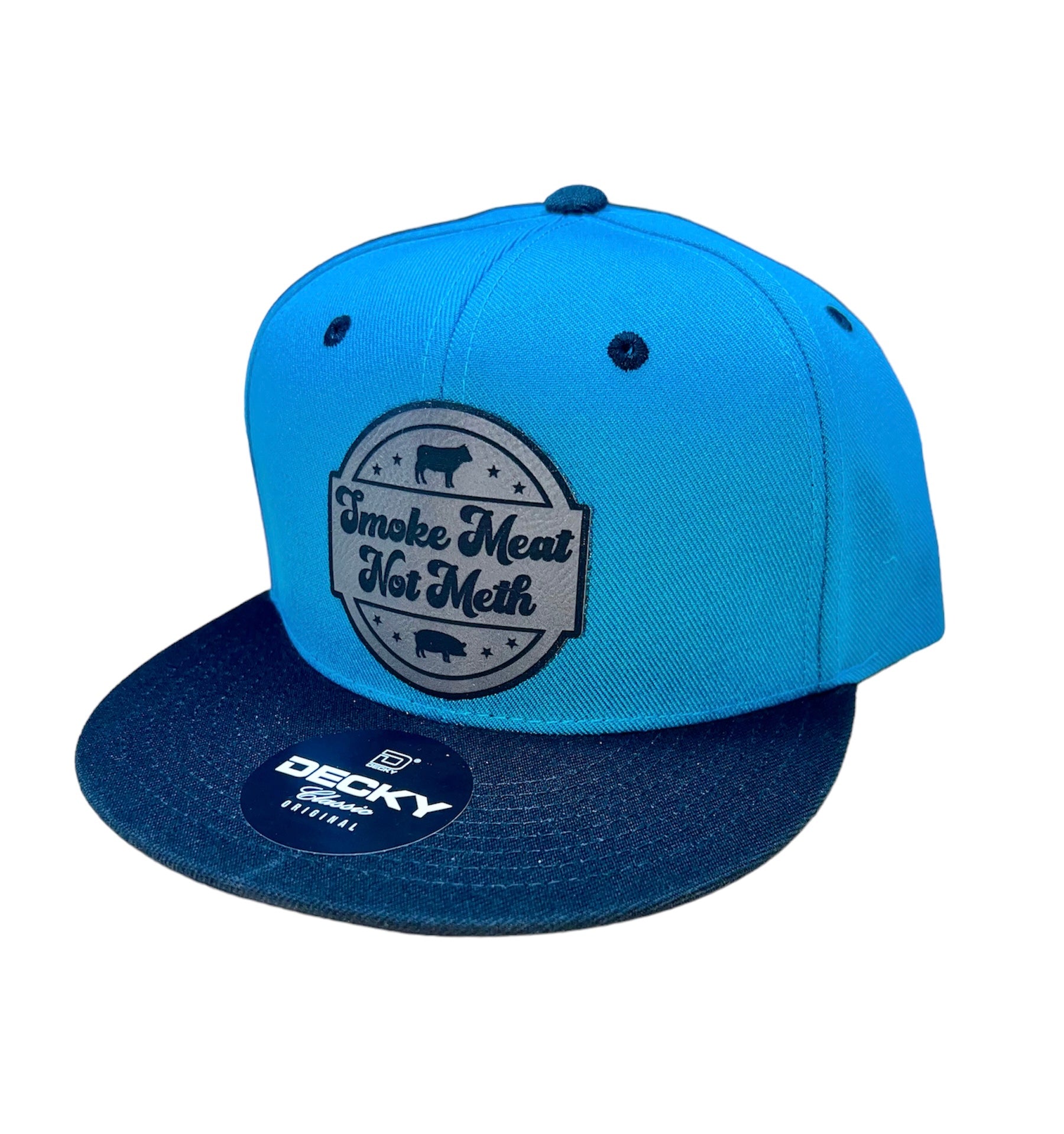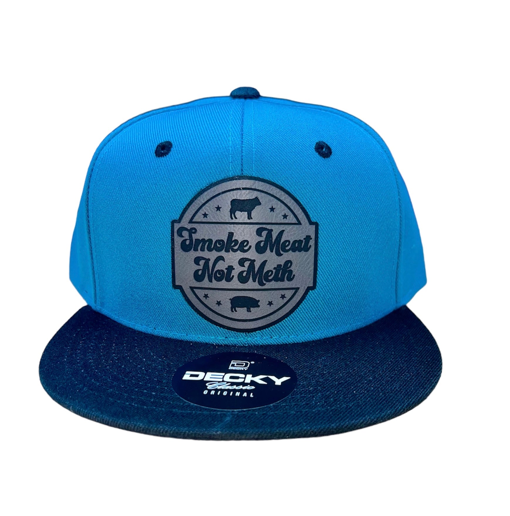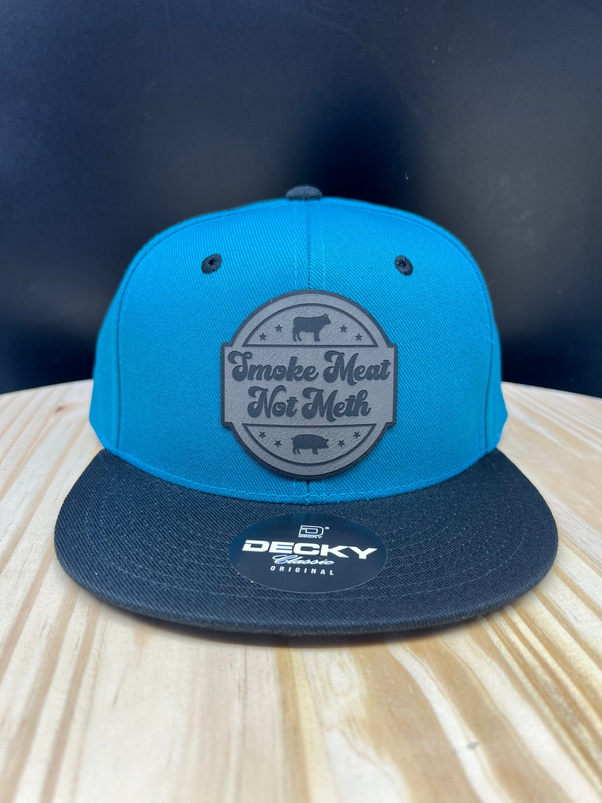 Teal/Black Hat Featuring: A Beige leatherette patch saying, “Smoke Meat, Not Meth.”