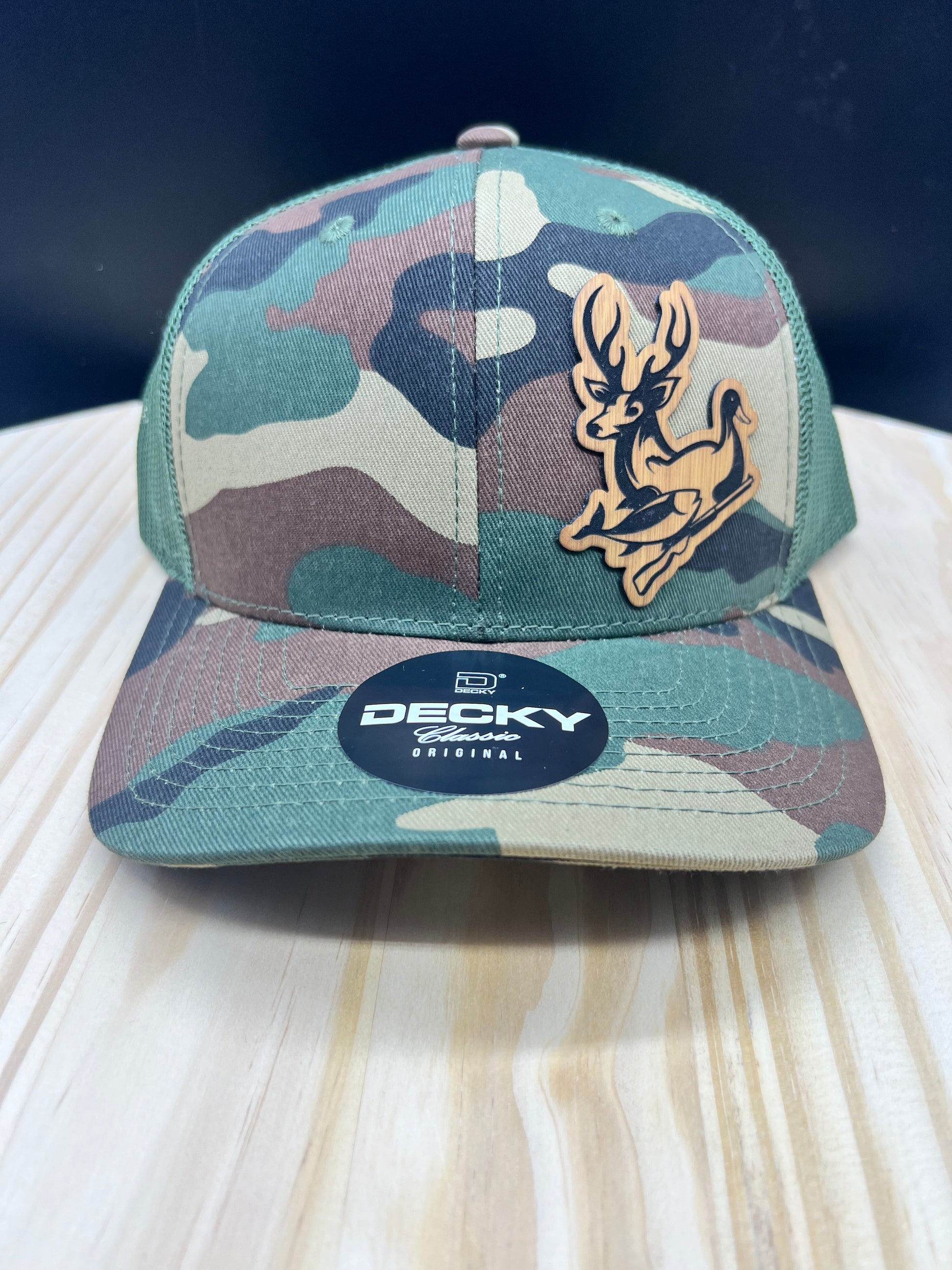 Camo/Olive Green Hat Featuring: A bamboo leatherette buck, duck, fish and gun patch.
