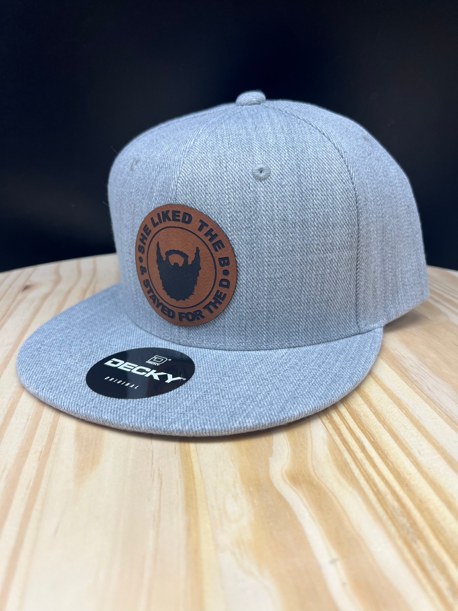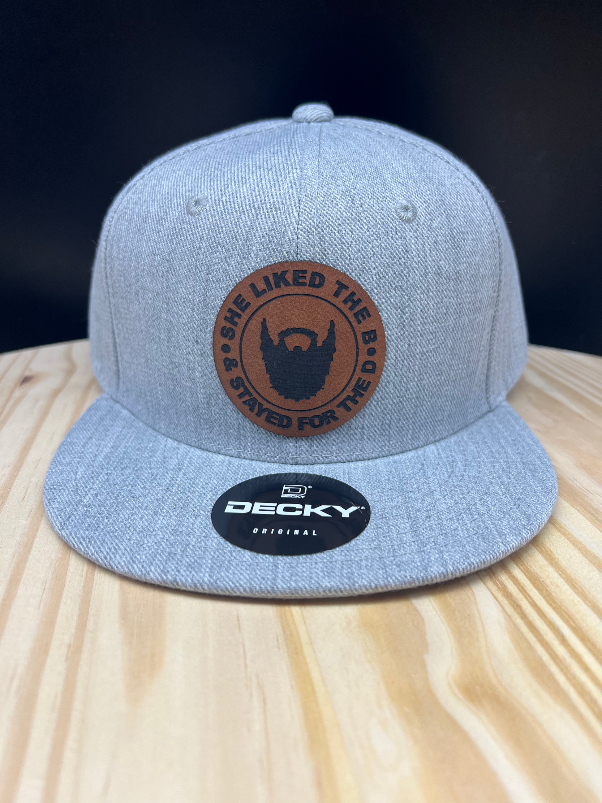 Heather Gray Hat Featuring: A Rawhide Brown leatherette patch saying, “She Liked the B & Stayed for the D.”