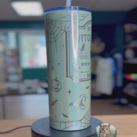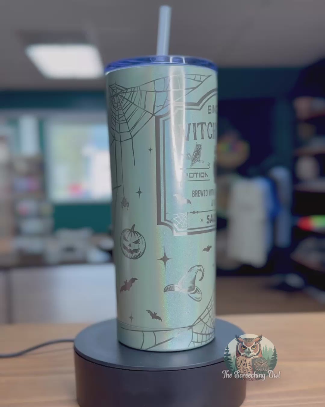Enhance your Halloween experience with our Witch's Brew Holographic Tumbler. This 23 oz tumbler features a mesmerizing holographic green color and a secure screw on lid with straw. The intricately laser engraved design adds a festive touch to your drink. Perfect for any spooky gathering.