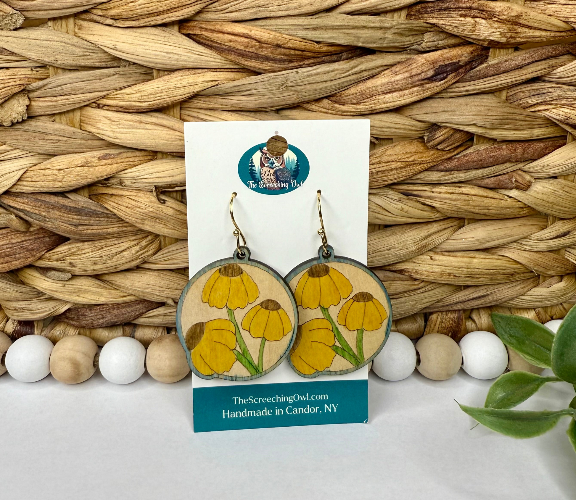 Yellow Flower Wood Earrings are made with white birch and silver colored stainless steel wires.